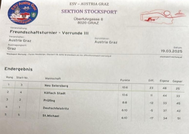 mit der wahrscheinlich besten Saisonleistung gelang es uns den ESV Deutschfeistritz in der Verlängerung zu Schlagen. Es war ein Top Spiel auf Augenhöhe. jeder kleine Fehler einer Mannschaft wurde sofort von der anderen bestraft. Hervor zu heben das Spiel 2, das von beiden Mannschaften fehlerfrei gespielt wurde und nur durch einen drauf schlagenden Stock mit 11:9 zu unseren Gunsten entschieden wurde.