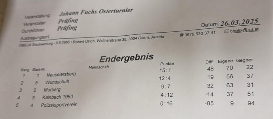 nach einer guten Leistung in den Gruppenspielen mit nur einer Niederlage erreichten wir den auszeichnenden 2.Gruppenplatz hintern dem ESV Kowald Voitsberg. Im Platzierungsspiel der beiden Gruppen war leider die Anspannung weg und es ging knapp verloren.