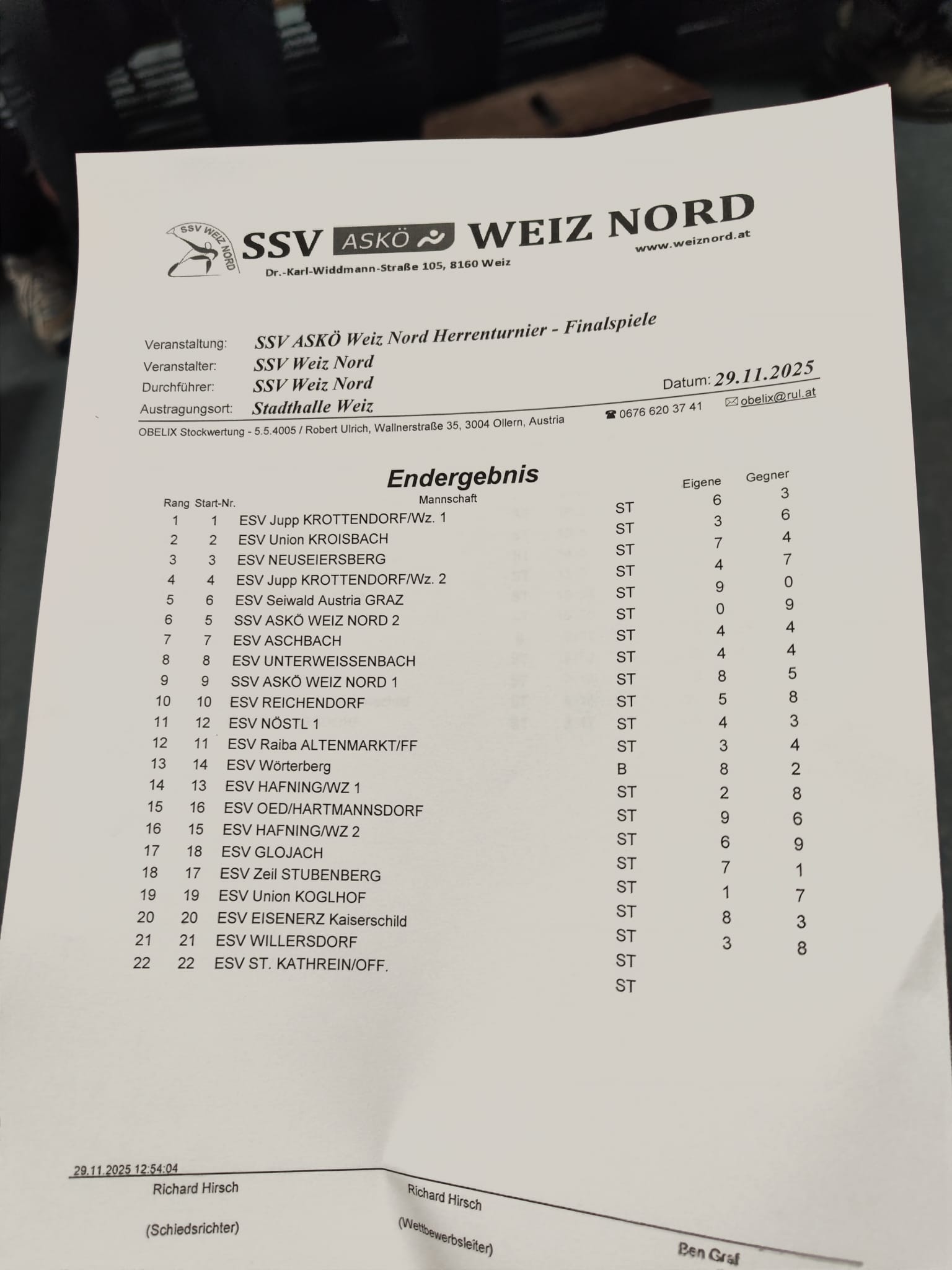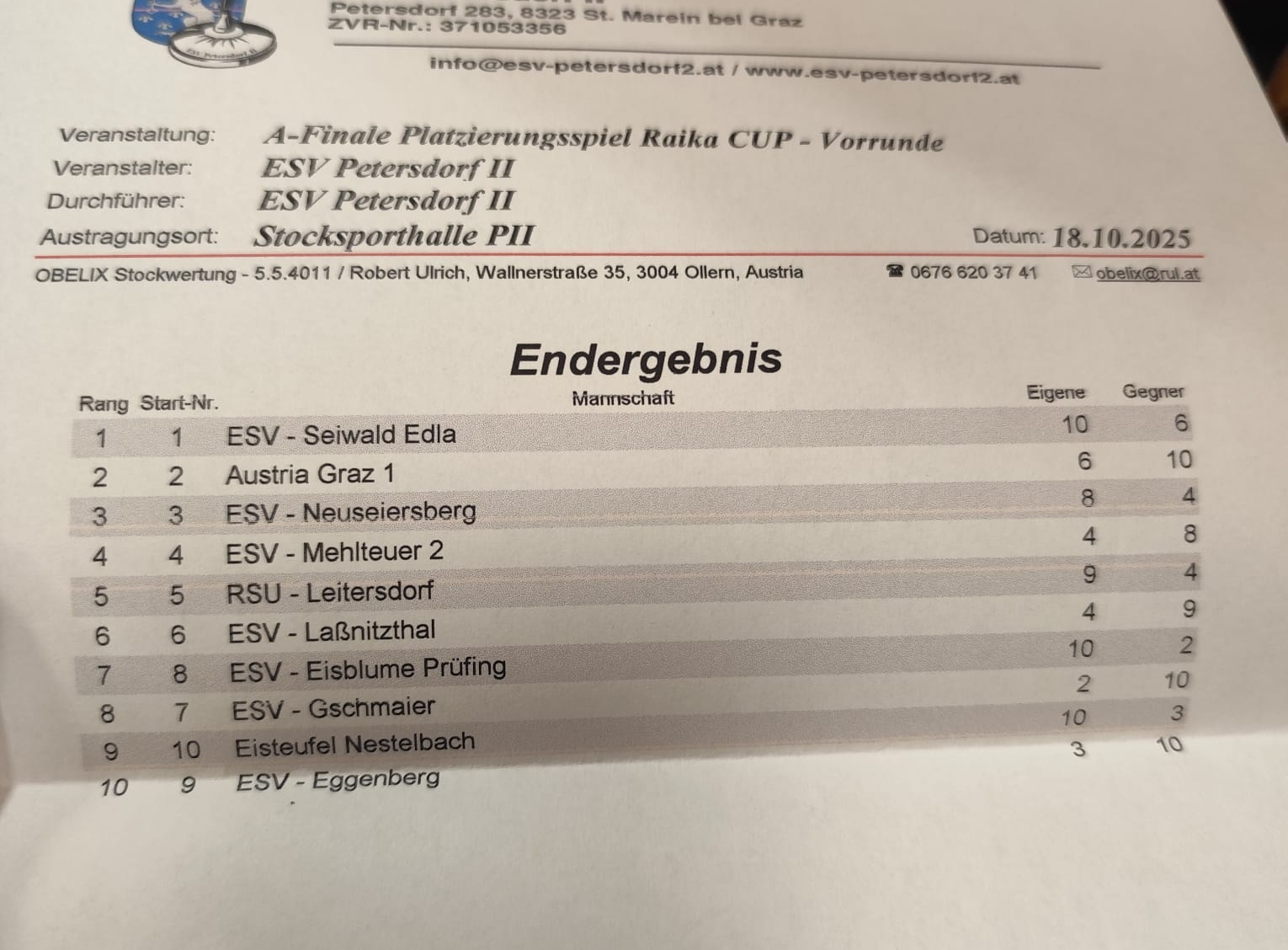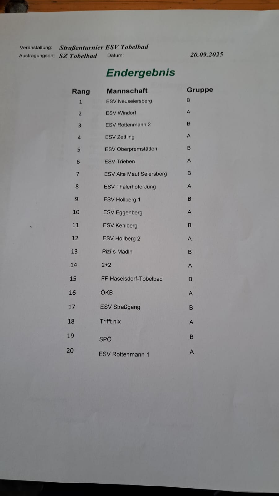 nach einer guten Leistung in den Gruppenspielen mit nur einer Niederlage erreichten wir den auszeichnenden 2.Gruppenplatz hintern dem ESV Kowald Voitsberg. Im Platzierungsspiel der beiden Gruppen war leider die Anspannung weg und es ging knapp verloren.