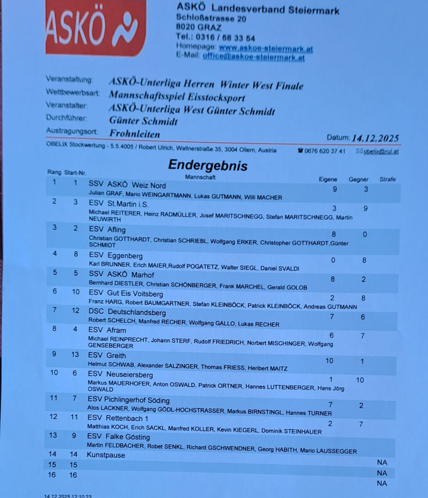 bei unserem ersten antretten bei der ASKÖ Meisterschaft mussten wir uns mit dem 12 Endplatz zufrieden geben. Nach einem guten Start wurde die Leistung leider schlechter. Nach einer durchwachsenen Gruppenphase gingen leider alle 3 Bahnenspiele verloren und es Blieb nur der 12.Platz.
